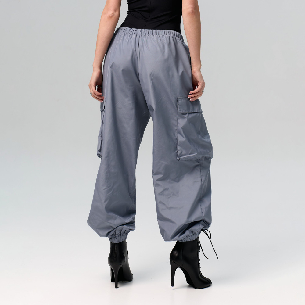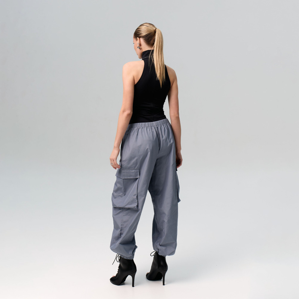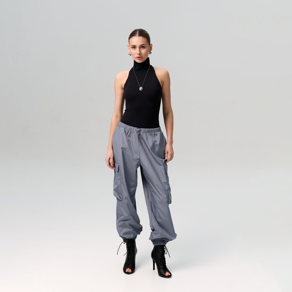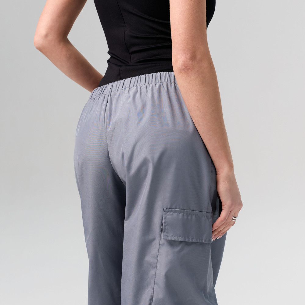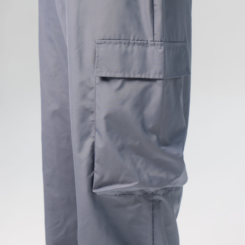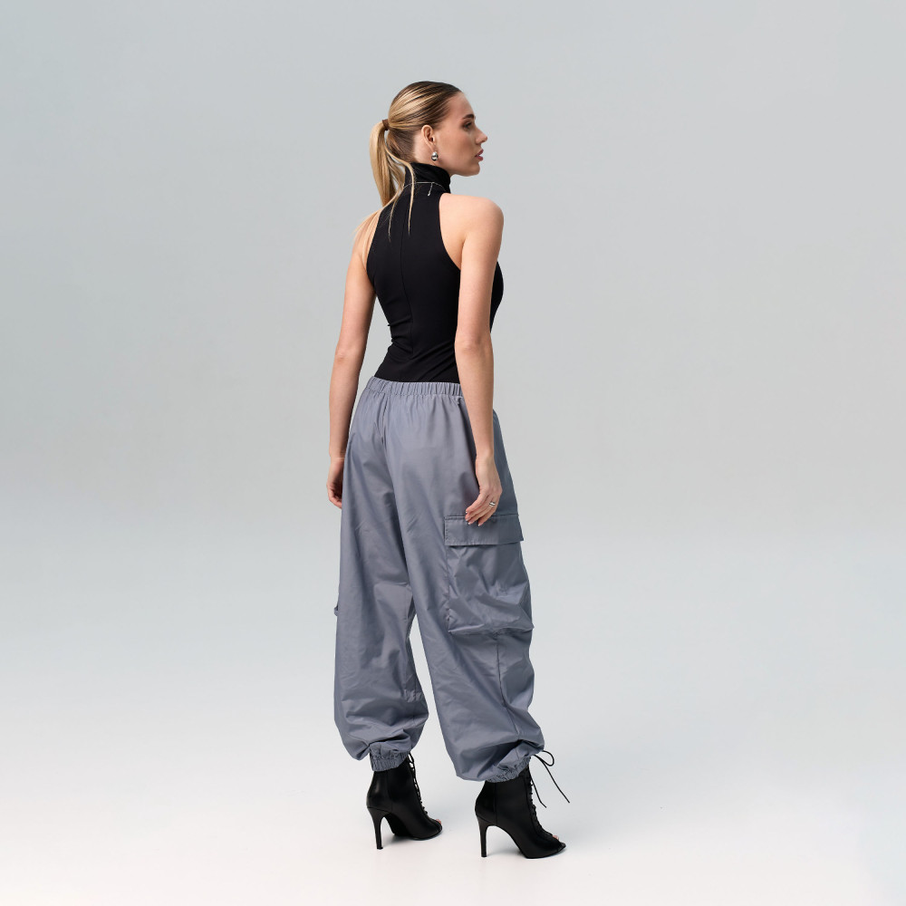 Grey cargo pants are made from lightweight and durable sports fabric with a windbreaker-style texture. The material provides comfort and freedom of movement during training and dance. It is wear-resistant and keeps its shape well, making the pants suitable for intensive training and active choreography. The relaxed fit and functional pockets make the design practical and comfortable.