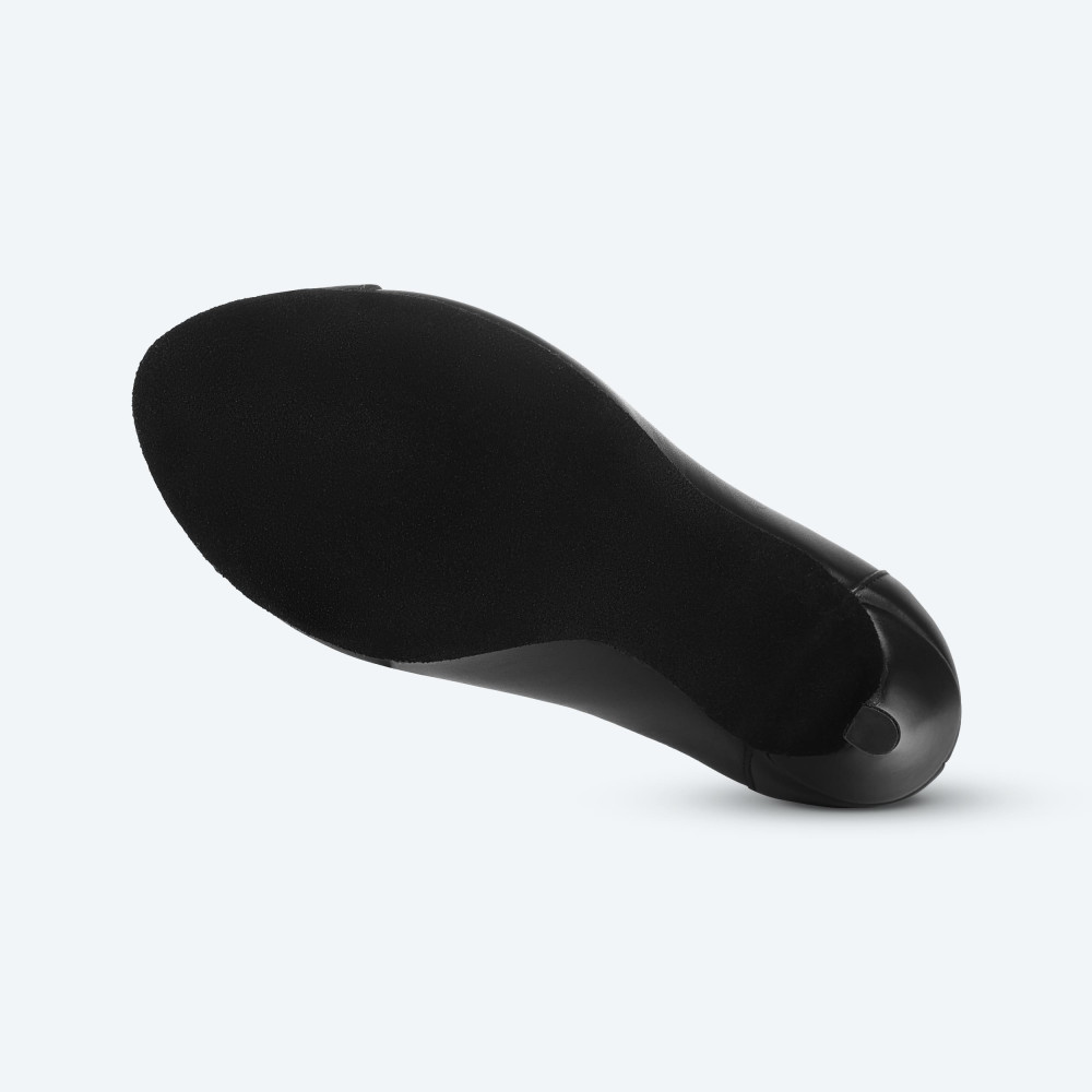 The black suede sole is suitable for parquet and professional dance floors, providing controlled glide. The 9 cm matte black heel is centered to support balance and proper weight distribution.